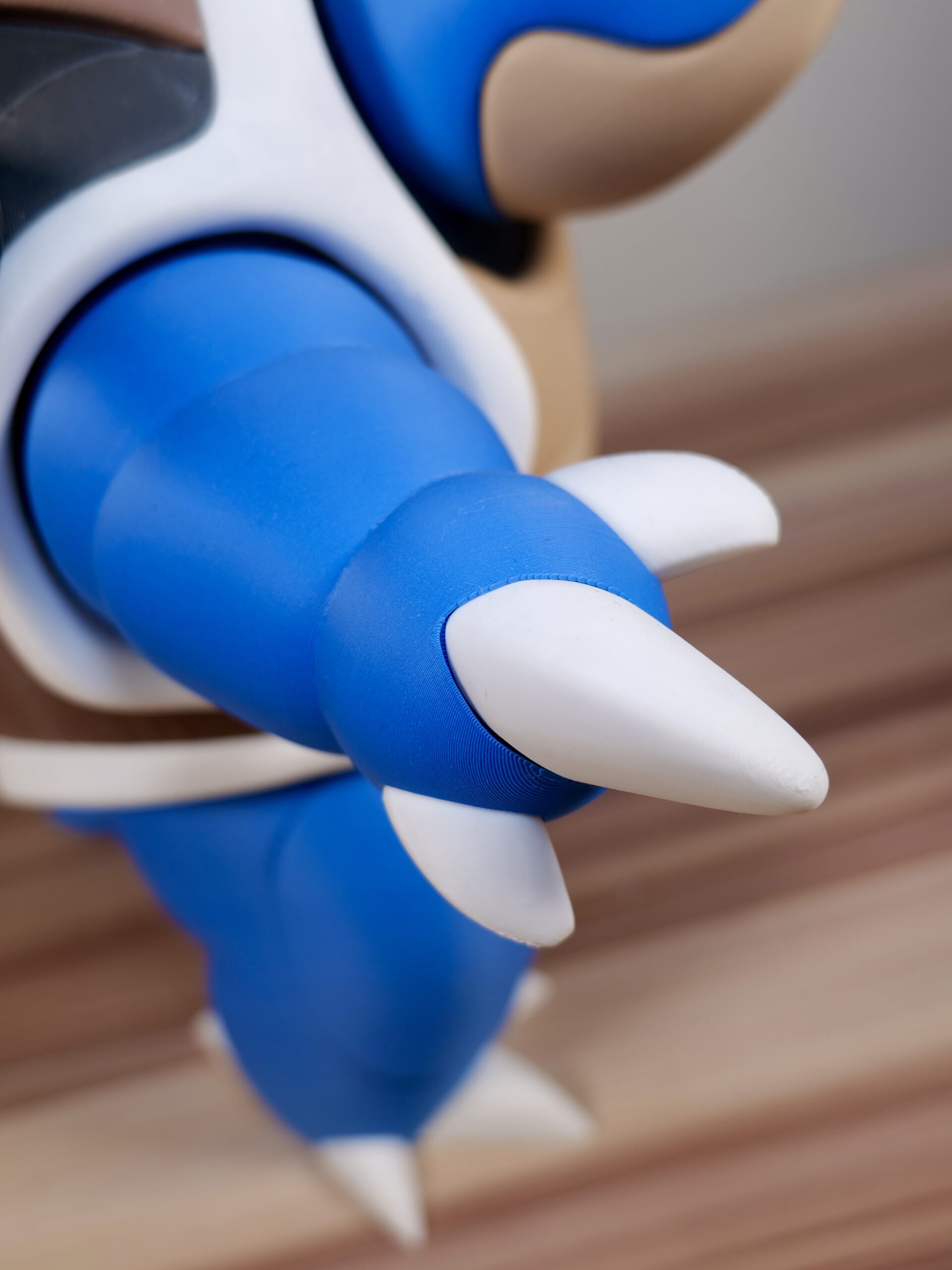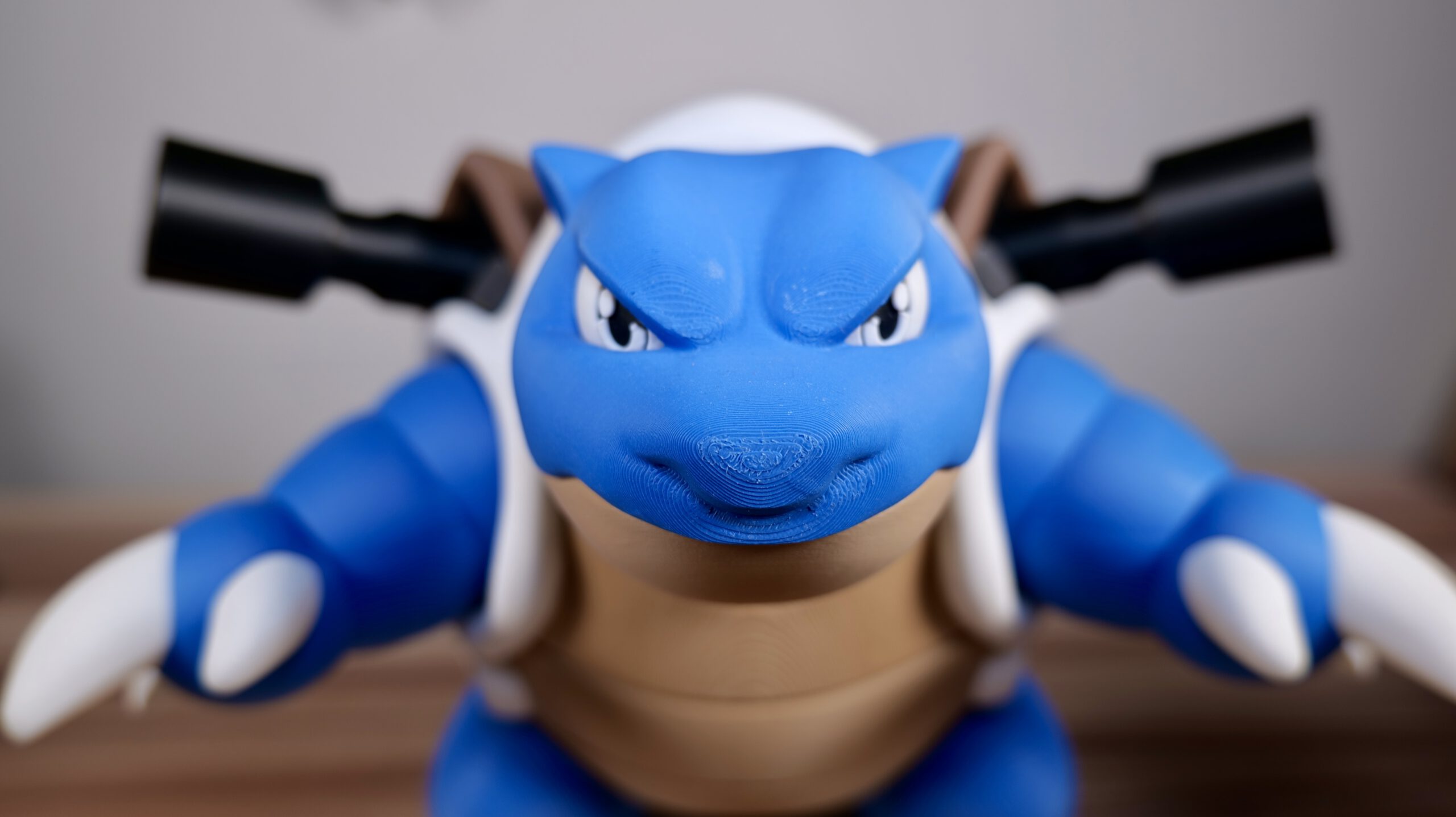 This Blastoise Pokemon was my first print of a prominent figure. I found it on printables.com and immediately wanted to build my own. Luckily, I had all the colors of filament I needed at home and started printing. The model is well thought out and split into multiple parts for easy printing—only the eyes required for a multi-material print. Assembling was satisfying except for the tail, which did not stick well while gluing. I used a filament called gun metal for the water canons, which turned out to be too dark. You better use flat silver instead.