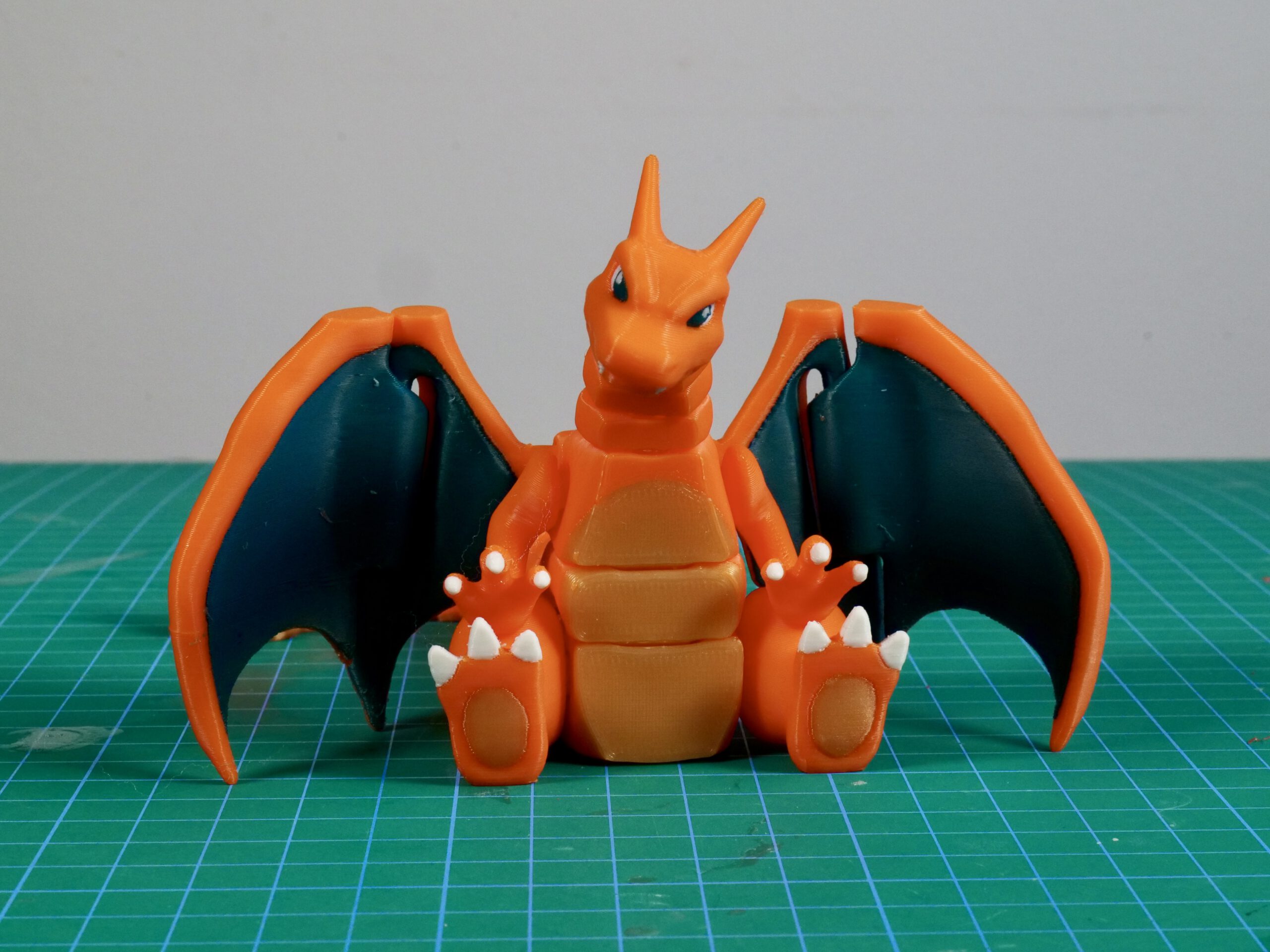 This is a flexible, articulated Charizard. It can stand on its feet and has a flexible neck, tail, and wings. It prints in place, requires no supports or assembly, and is compatible with PLA. I used a BambuLab AMS to print orange, white, gold, and dark green.