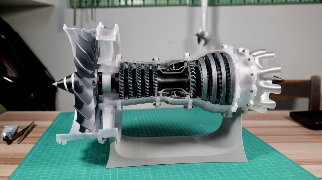 This build is about a cutaway model of a 2-spool high bypass turbofan designed by catiav5ftw. It’s part of the hardware kit series of Bambu Labs, where you buy all hardware, like screws and motors, and print all other parts yourself. So, I directly started printing this model. It was easy, but I had no more white PLA and switched to transparent PETG, which I had been sitting on the shelf for some time.
