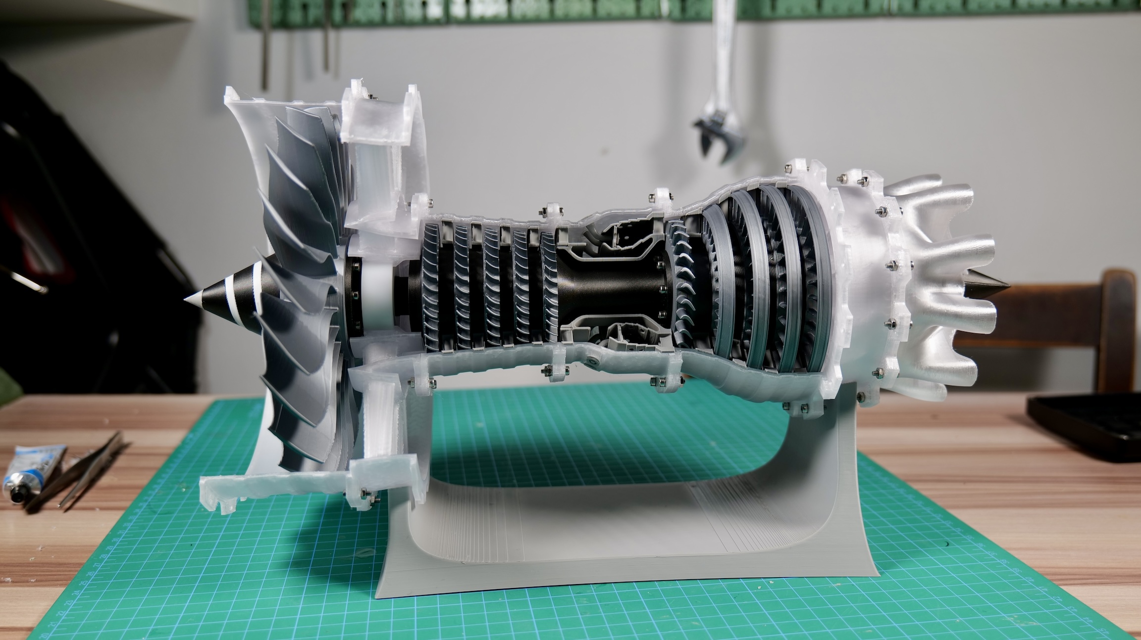 Assembling took some time due to the large number of screws and nuts, but in general, it was not too hard. After finishing the build, I ended up with a nice-looking model with spinning blades to showcase the function of a jet engine. Here are the key stages: