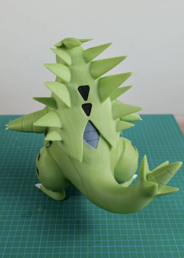 One of my viewers sponsored the files for this model. He wanted to see Tyranitar 3D-printed and bought the files. I had to split up the model to fit on my Bambu Lab X1C and reduce overhangs. I used my AMS to print in multiple colors but found a problem while printing the upper torso. I needed five colors, but one AMS only holds up to four spools. However, because of the part’s coloring, I could pause the print and swap out one spool, which was no longer needed after a certain height. Gluing together all the parts finished up this build.